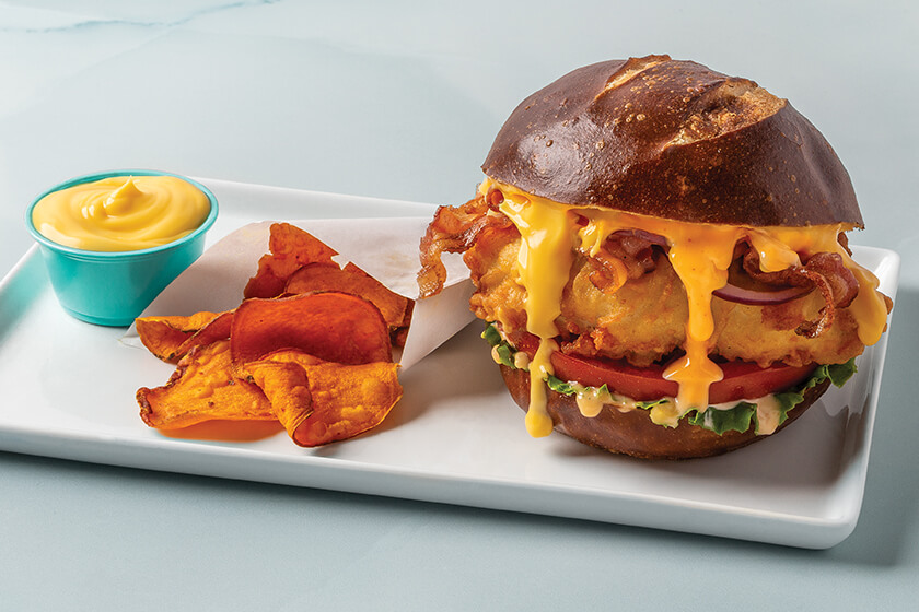 Similarly, the recipes for this indulgent Buttermilk Fried Chicken Bacon Cheddar Sandwich starts with Muy Fresco® Mild Cheddar Cheese Sauce. But chefs can employ other AFP sauces to produce variations in flavor complexity. “Increase the cheddar cheese intensity to create a rich, comforting flavor,” Gable suggests. “Or incorporate flavor differentiation by using a sharper type, like Wisconsin cheddar.” This recipe further dials up the crave factor by adding an aioli made with mayonnaise, maple syrup and Sriracha.